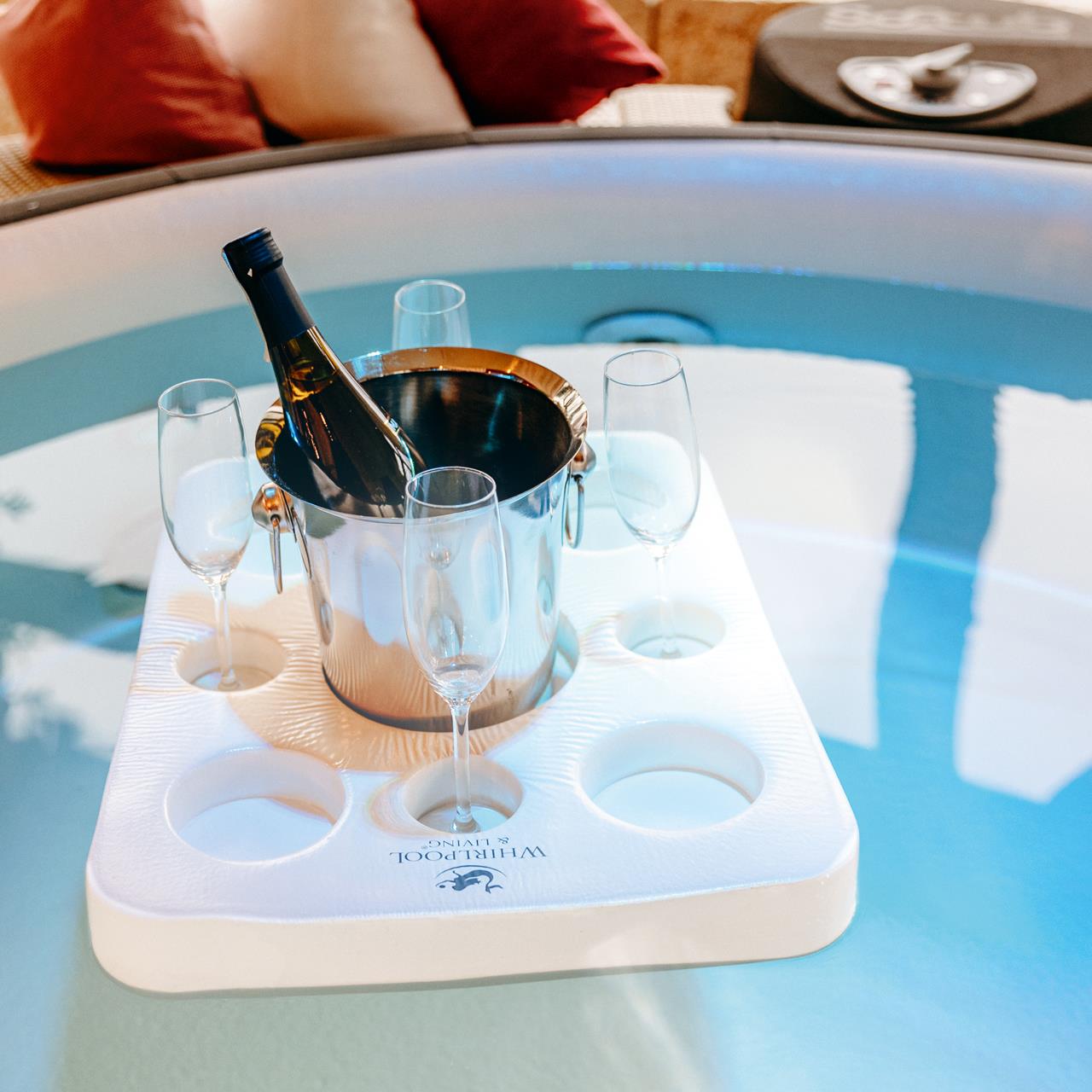 Ein schwimmendes Tablett, dessen Vertiefungen für Flaschen, Gläser oder Flaschenkühler vorbereitet sind. Hier können Sie sorglos Ihre Getränke oder sonstige Utensilien ablegen. Selbst im Sprudelbetrieb schwimmen Ihre Mitbringsel sicher auf diesem "Tisch".