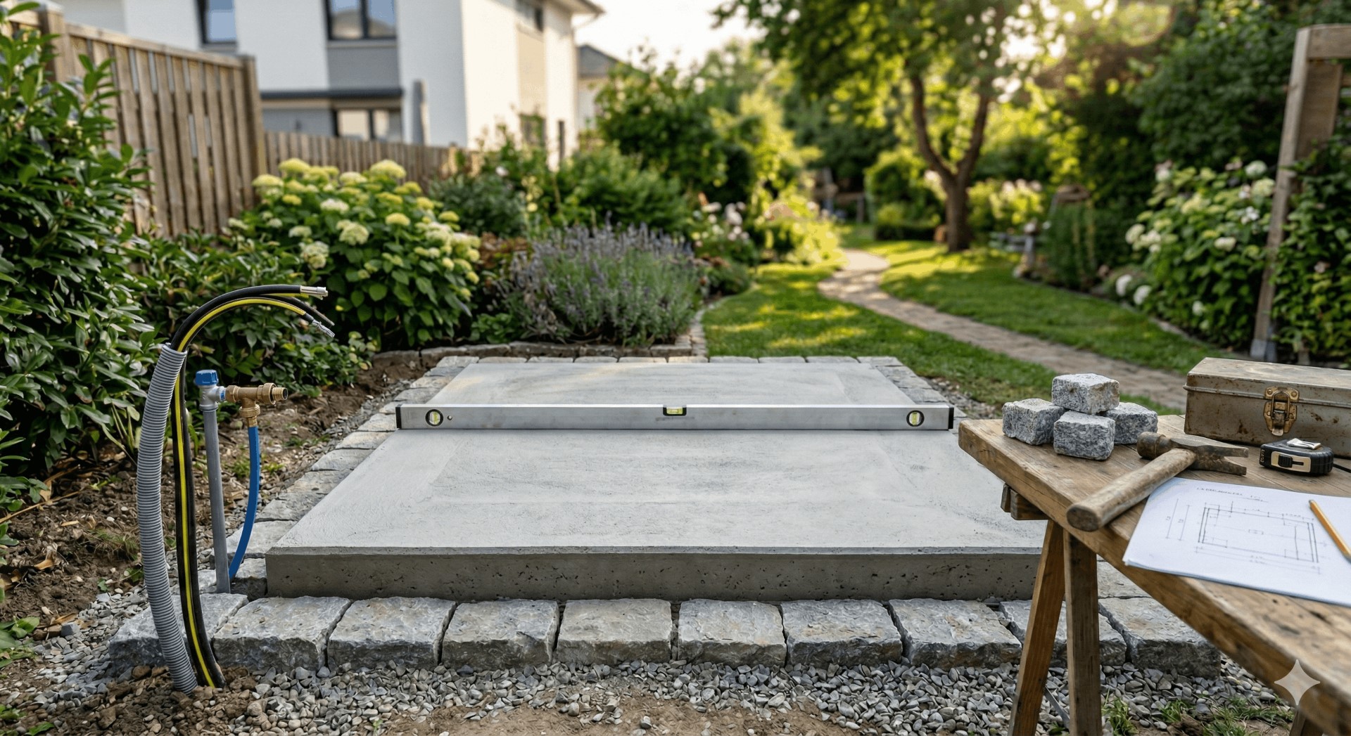 Ein Betonfundament bietet maximale Stabilität und ist besonders für große, schwere Whirlpools empfehlenswert. Beton ist äußerst strapazierfähig, wetterfest und praktisch wartungsfrei. Wenn bereits eine solide Betonterrasse vorhanden ist, können Sie den Whirlpool oft direkt darauf aufstellen. Ansonsten lässt sich eine neue Fundamentplatte gießen. Wichtig dabei: Mindestens 10 cm Stärke und eine Bewehrung (Stahlarmierung), um Rissbildung zu vermeiden. Gießen Sie den Beton auf frostfreiem, verdichtetem Untergrund und lassen Sie ihm genug Zeit (mind. 28 Tage) zum Aushärten, bevor der Whirlpool darauf kommt. Eine Betonplatte bietet eine absolut ebene Fläche und verteilt die Last optimal.